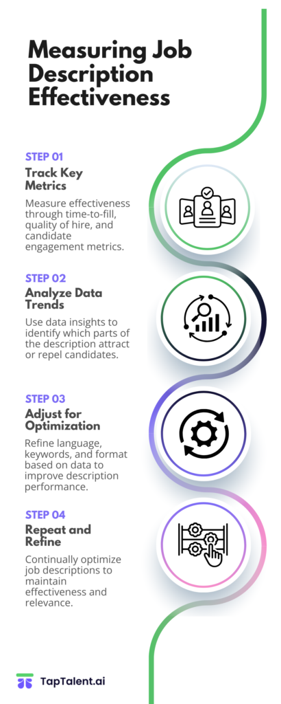Having optimized your job descriptions for Applicant Tracking Systems (ATS) and search engines in Section III, the next important step is to measure their effectiveness. Understanding how your descriptions perform in attracting the right talent and making necessary adjustments is crucial for ongoing success. Just as a well-planned marketing campaign uses metrics to gauge success, so too should your recruitment strategy.