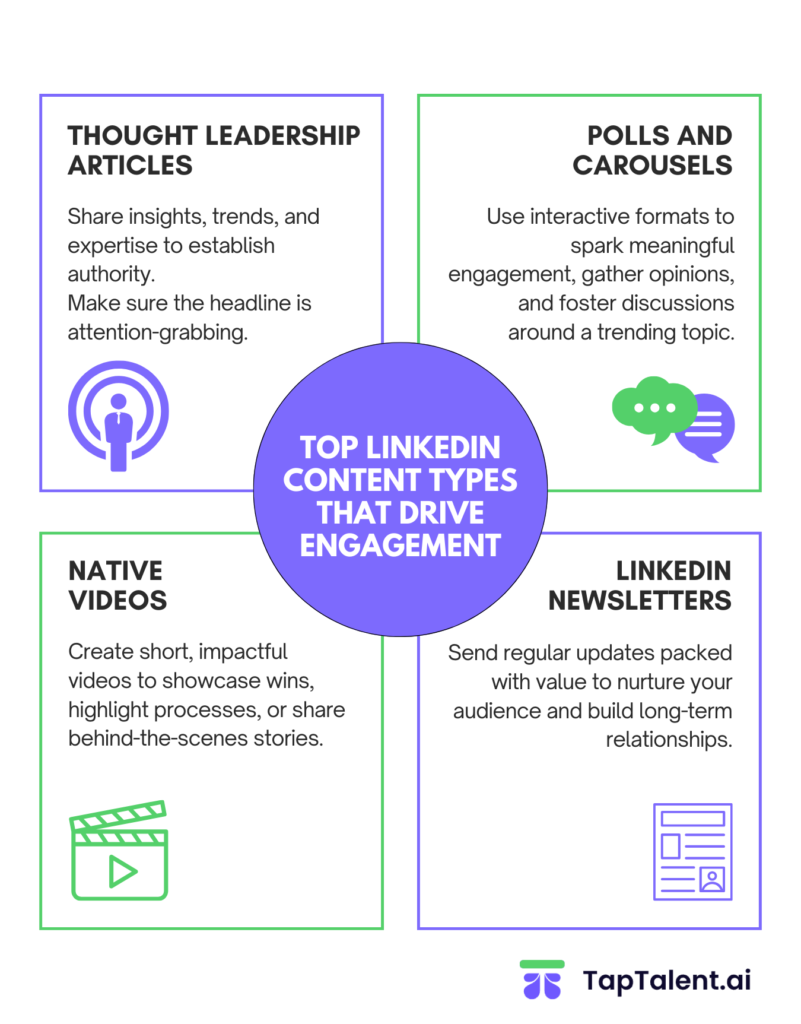 • Mix formats: 1 article, 1 video, 1 poll/carousel, and 1 thought-provoking post.
